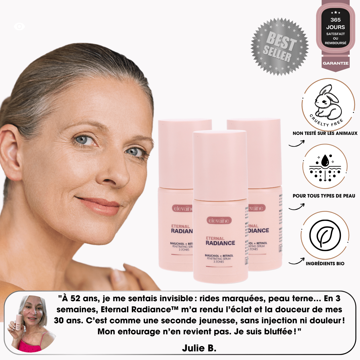 Je suis extrêmement satisfaite de la qualité exceptionnelle d'Eternal Radiance ainsi que de la rapidité de la livraison ! Pour la première fois de ma vie, j'ai continué à utiliser un produit après seulement quelques essais. Cela fait maintenant des mois que je l'utilise, et chaque jour, je vois une nette amélioration de ma peau, endommagée au fil des années. Ce sérum est devenu mon secret de beauté. À plus de 60 ans, je me sens aussi radieuse qu'à 30 ans. Merci infiniment !